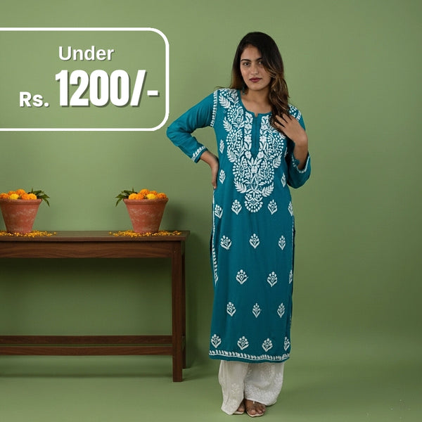 Aqua Blue Pure Modal Kurti with White Handwork Chikankari Embroidery