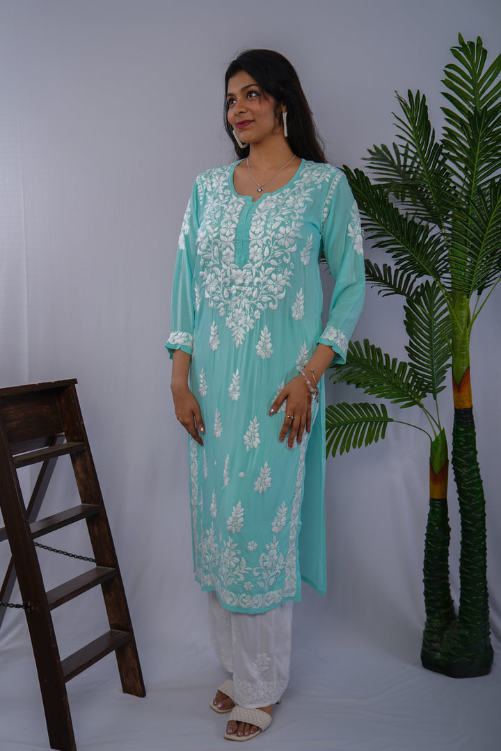 Aqua Blue Pure Modal Kurti with White Handwork Chikankari Embroidery