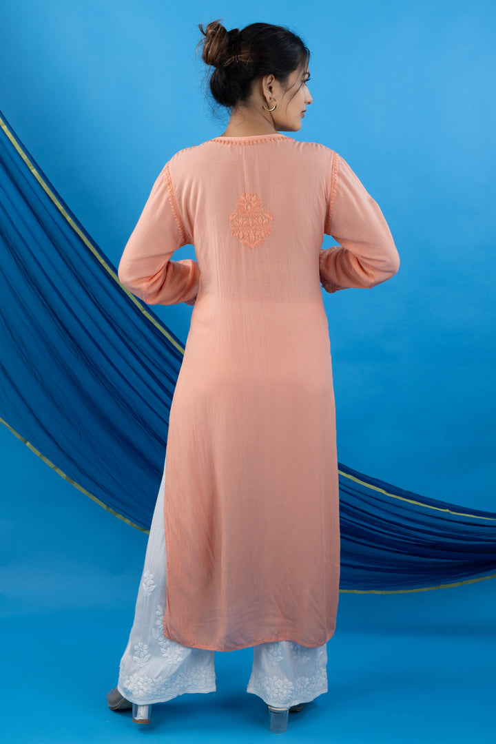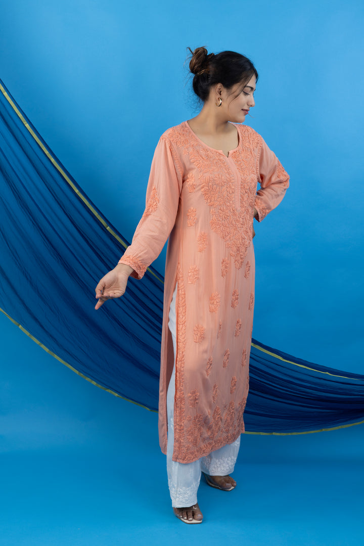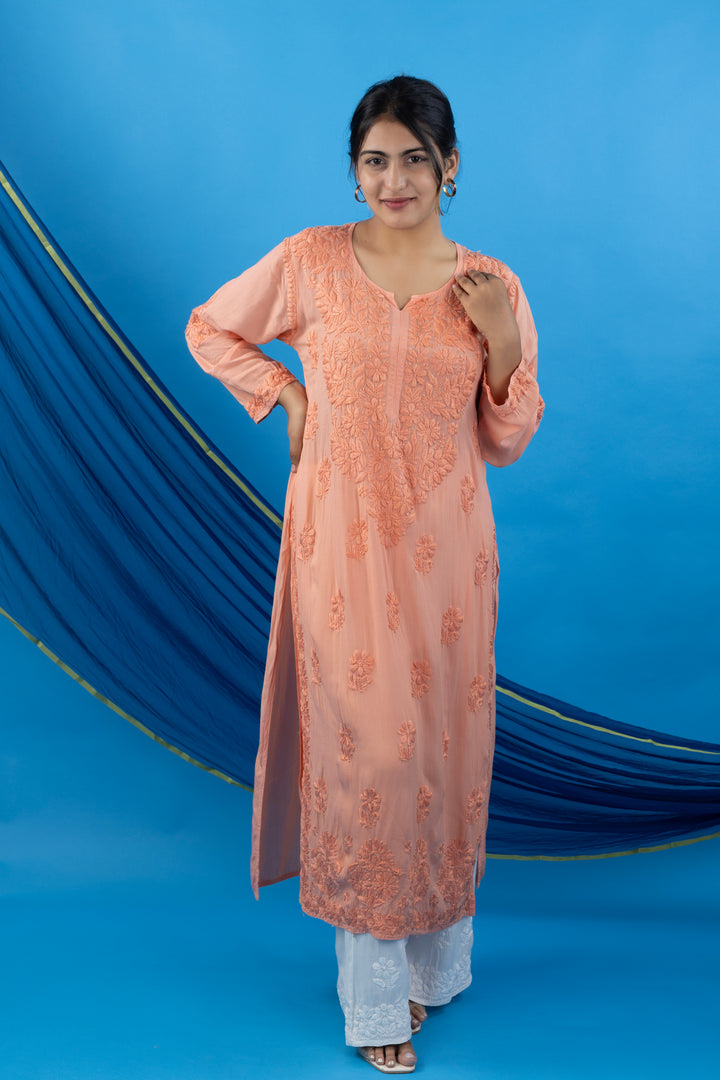 Orange Modal Kurta with Self-Tone Hand Chikankari Embroidery