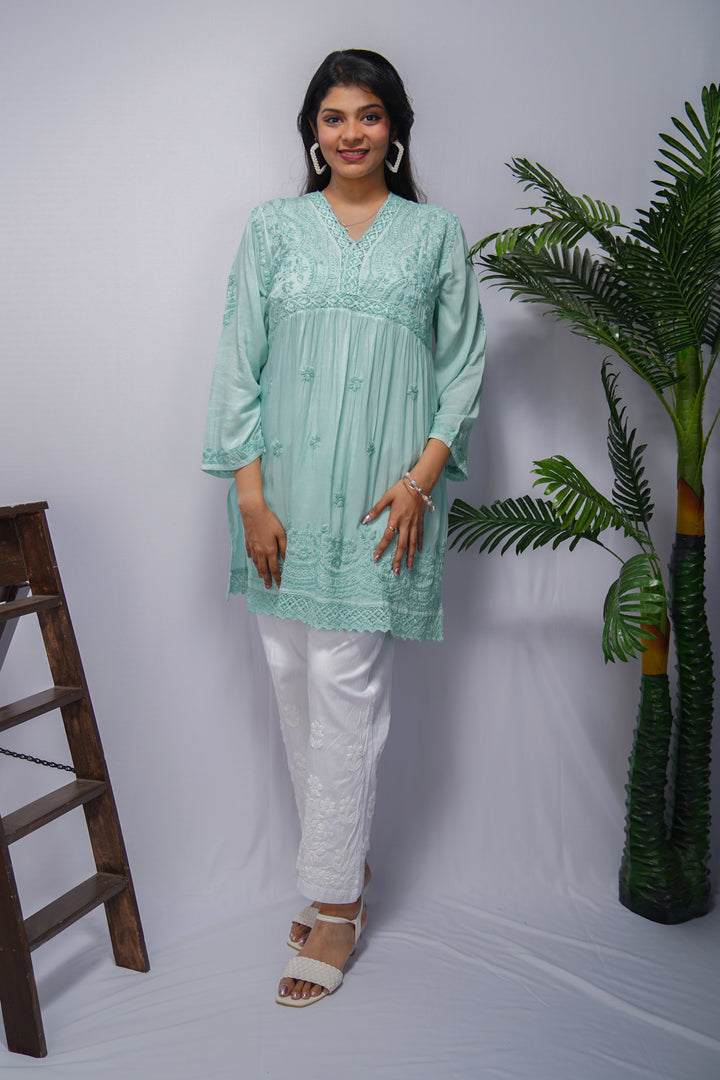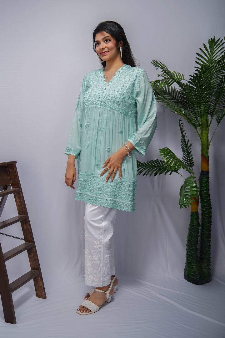 Mint Green Modal Short Frock Kurta with Hand Chikankari & Qureshia Lace