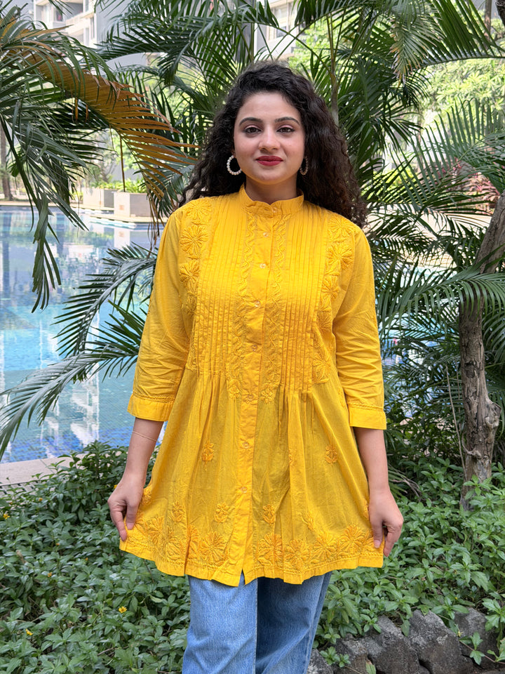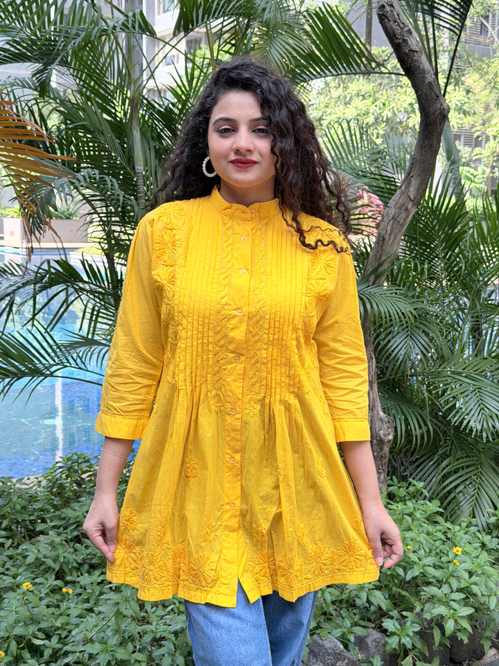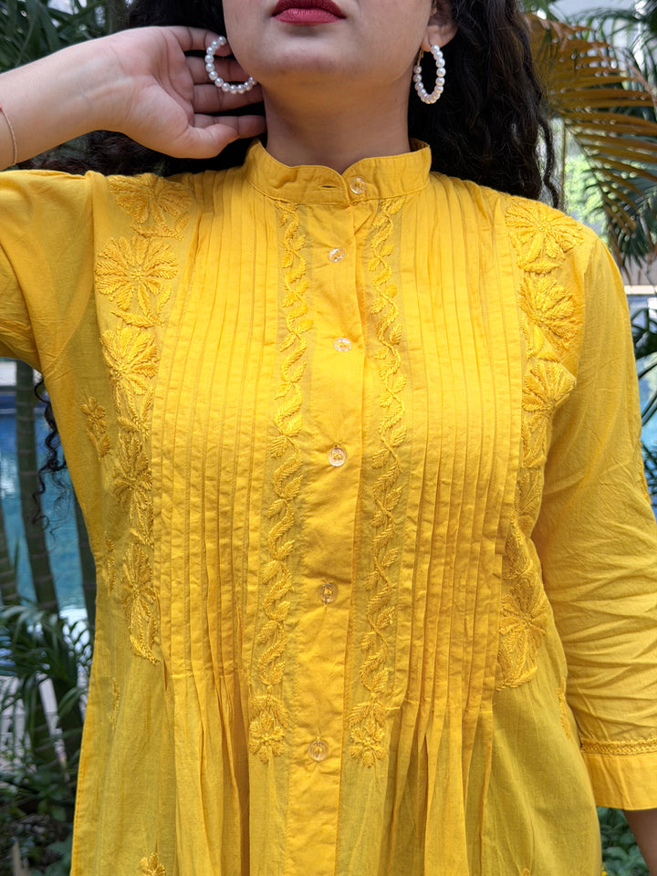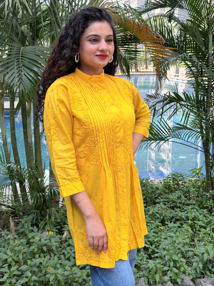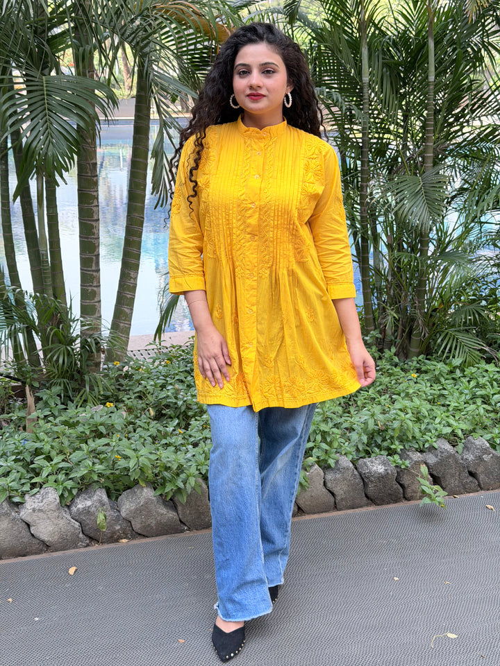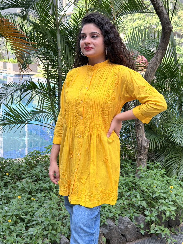 Bright Mustard Yellow Mul Cotton Chikankari Shirt Kurti