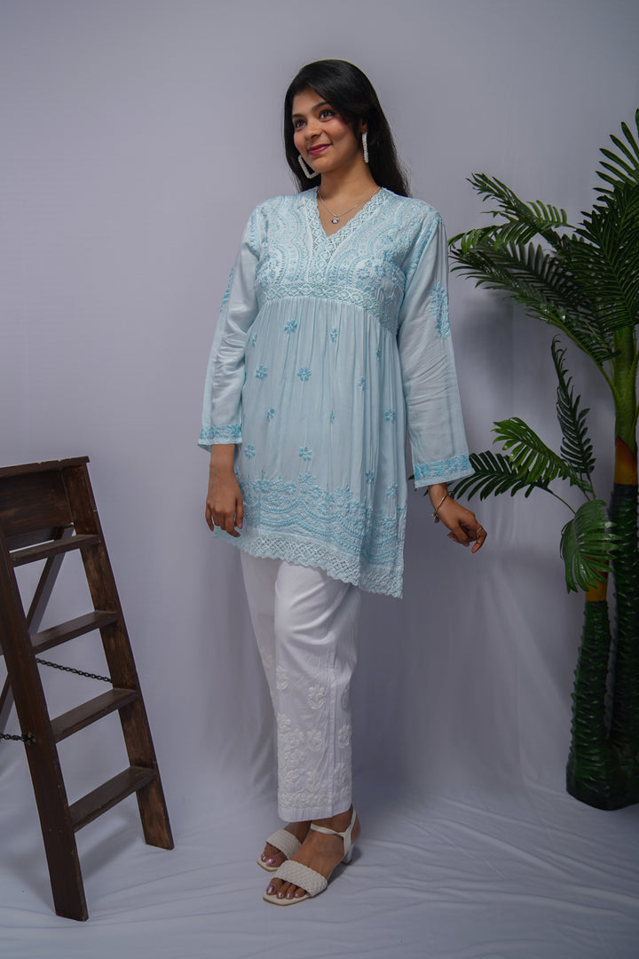 Sky Blue Modal Short Frock Kurta with Hand Chikankari & Qureshia Lace