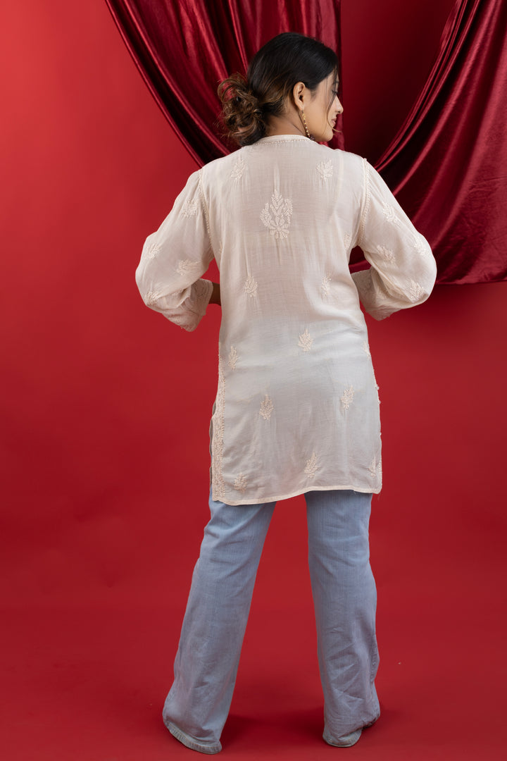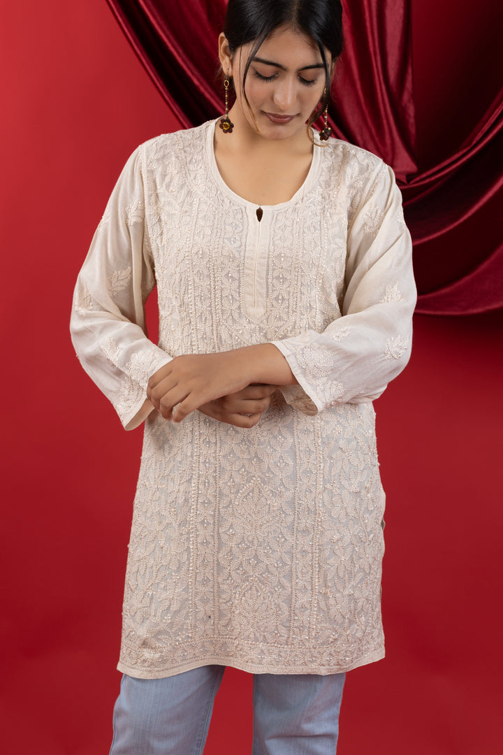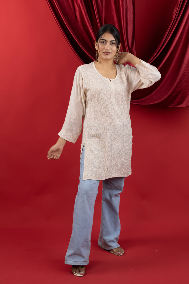 Beige Muslin Short Kurti with Hand Chikankari Jaal Embroidery