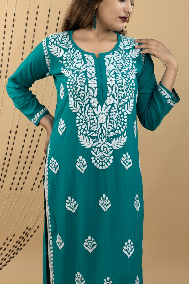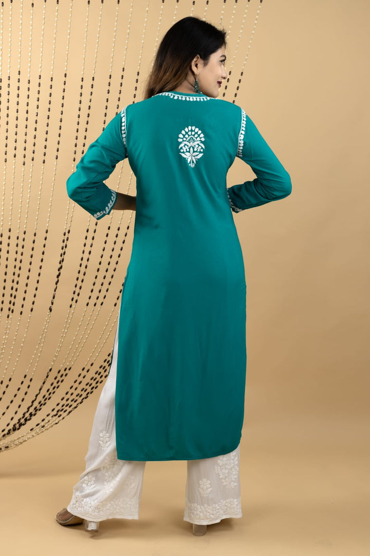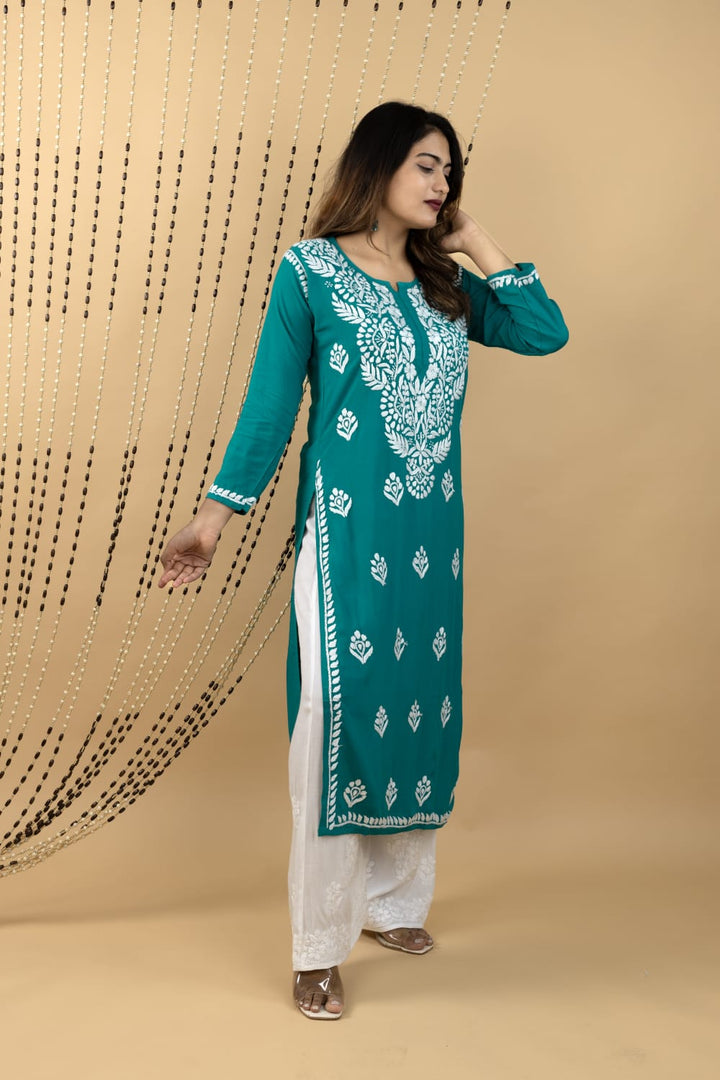Teal Green Rayon Kurta with Chikankari Embroidery