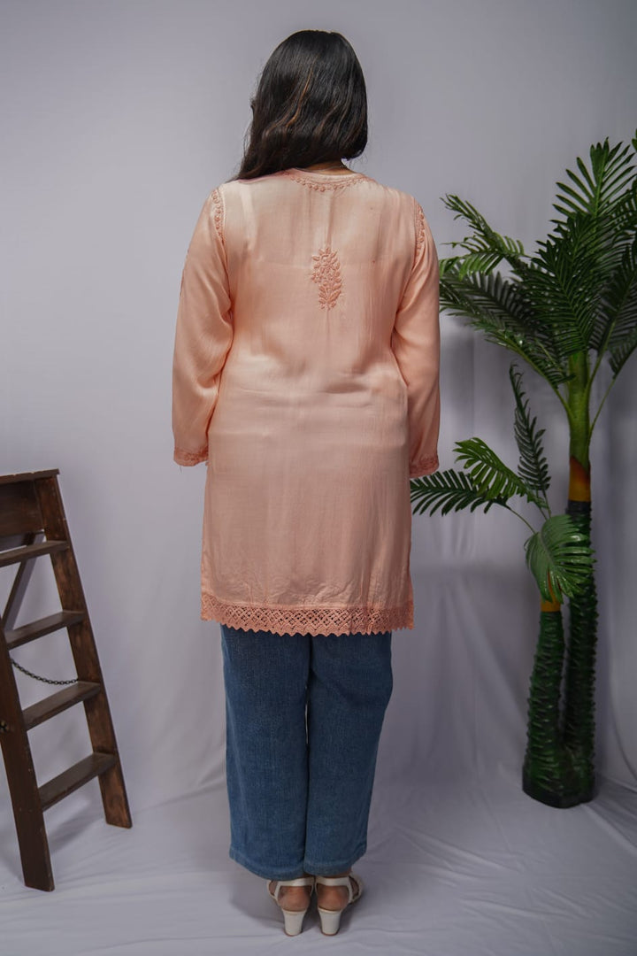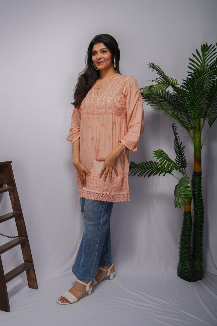 Peach Modal Short Frock Kurta with Hand Chikankari & Qureshia Lace