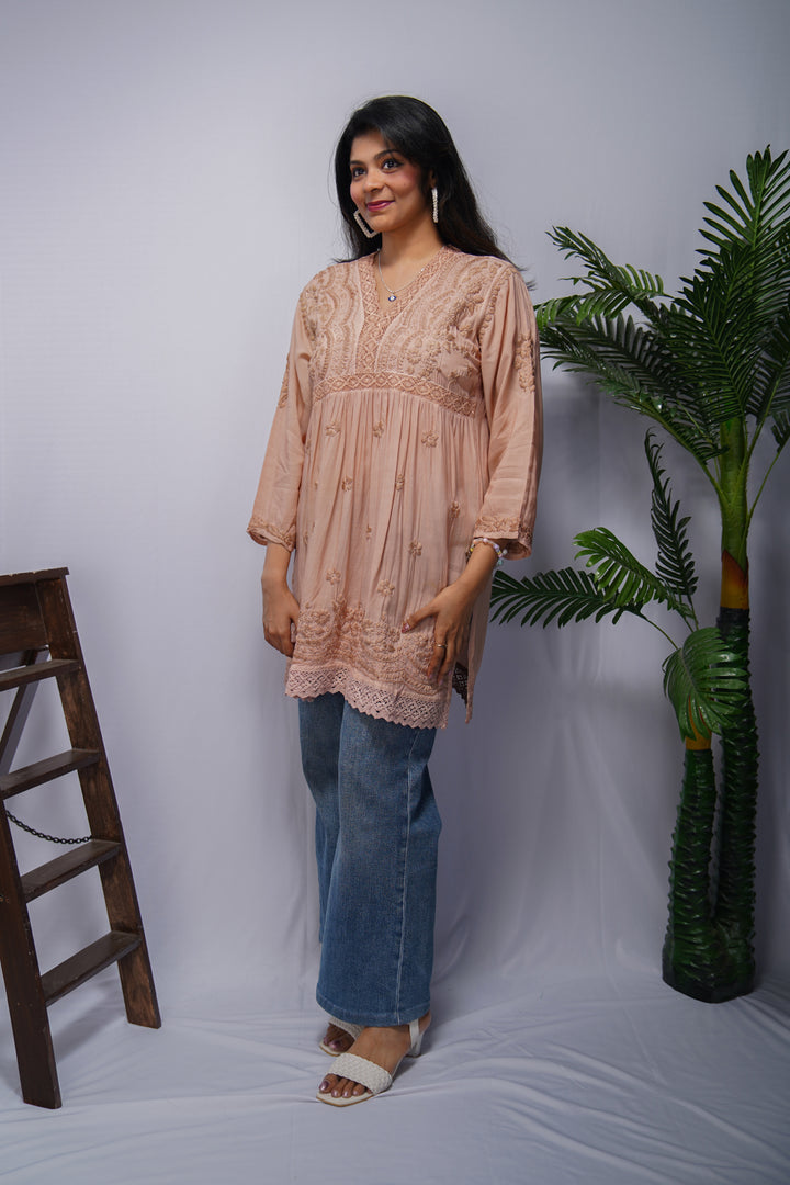 Dusty Brown Modal Short Frock Kurta with Hand Chikankari & Qureshia Lace