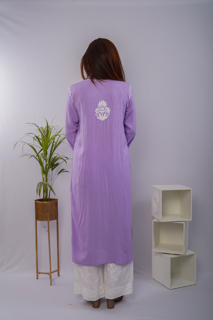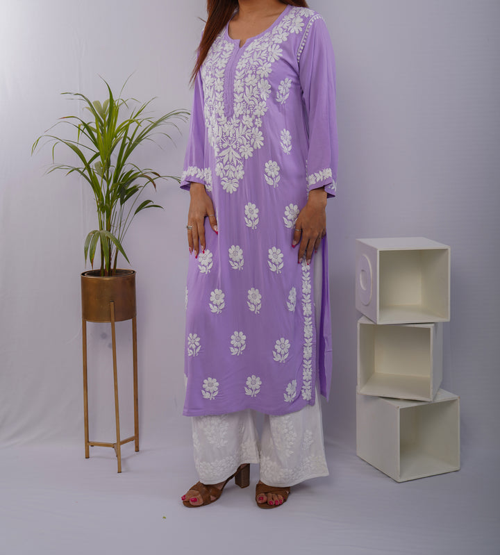 Lavender Heavy Rayon Kurti with White Chikankari Hand Embroidery