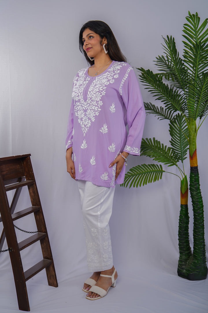 Lilac Bloom Pure Rayon Chikankari Short Kurta – Hand Embroidered Elegance