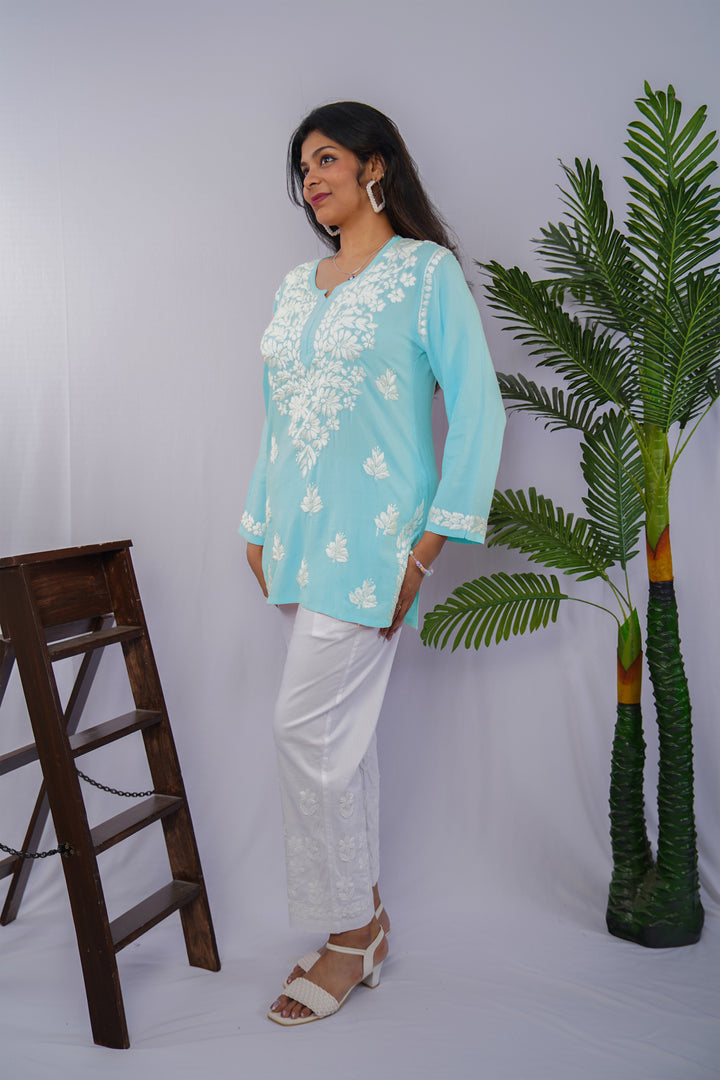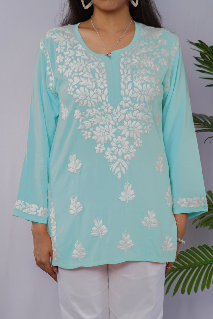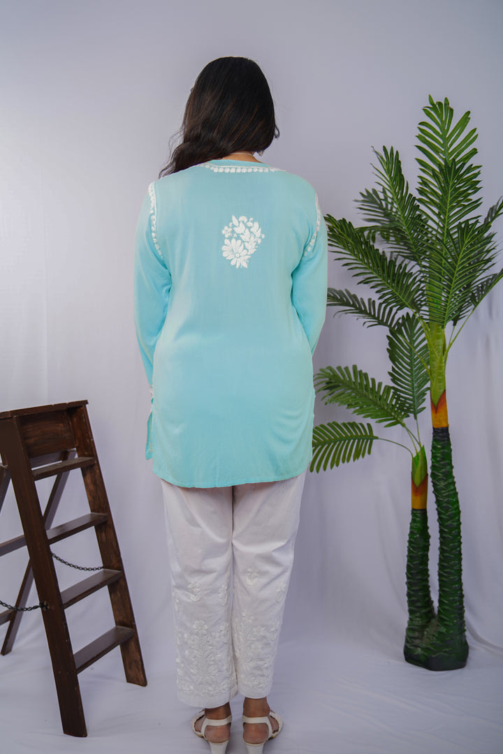 Sky Blue Rayon Chikankari Short Kurta – Elegant Handcrafted Beauty